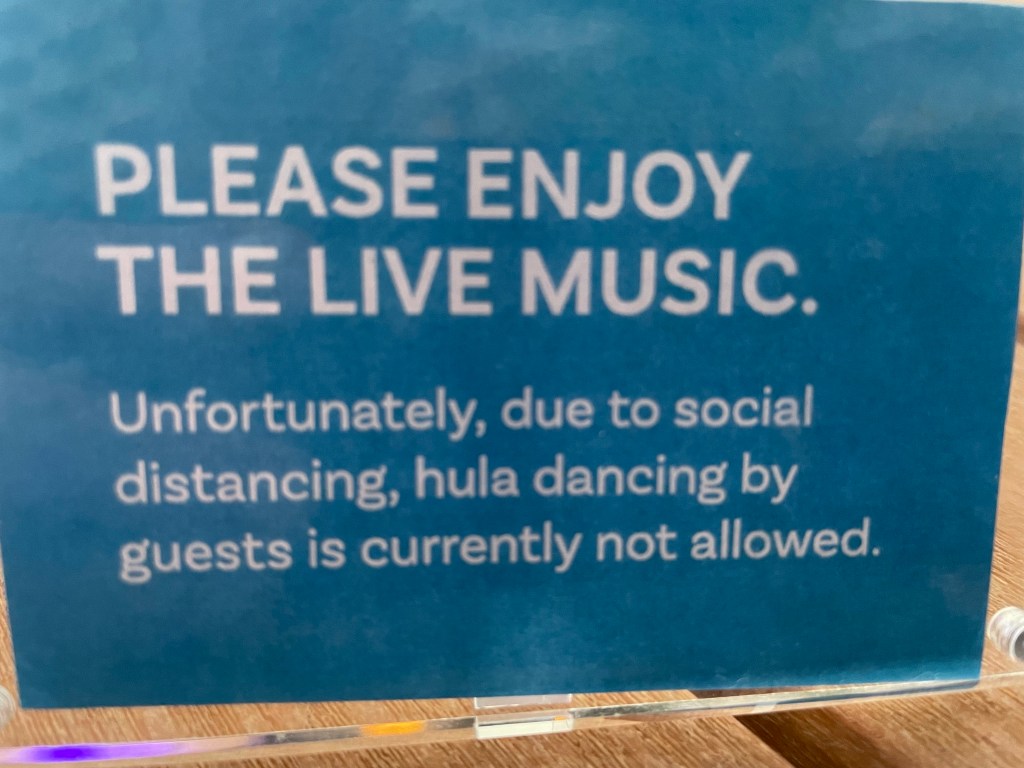 Went to Outrigger Reef Kanikapila Bar (Kanikapila means let’s make music). Heard a great rio, E Nei. Sadly, they ban people from dancing because of covid. Part of the fun of live Hawaiian music has always been the audience participation. No matter who was performing, someone would get up and dance. Another tradition lost to covid. This is the card on the table.