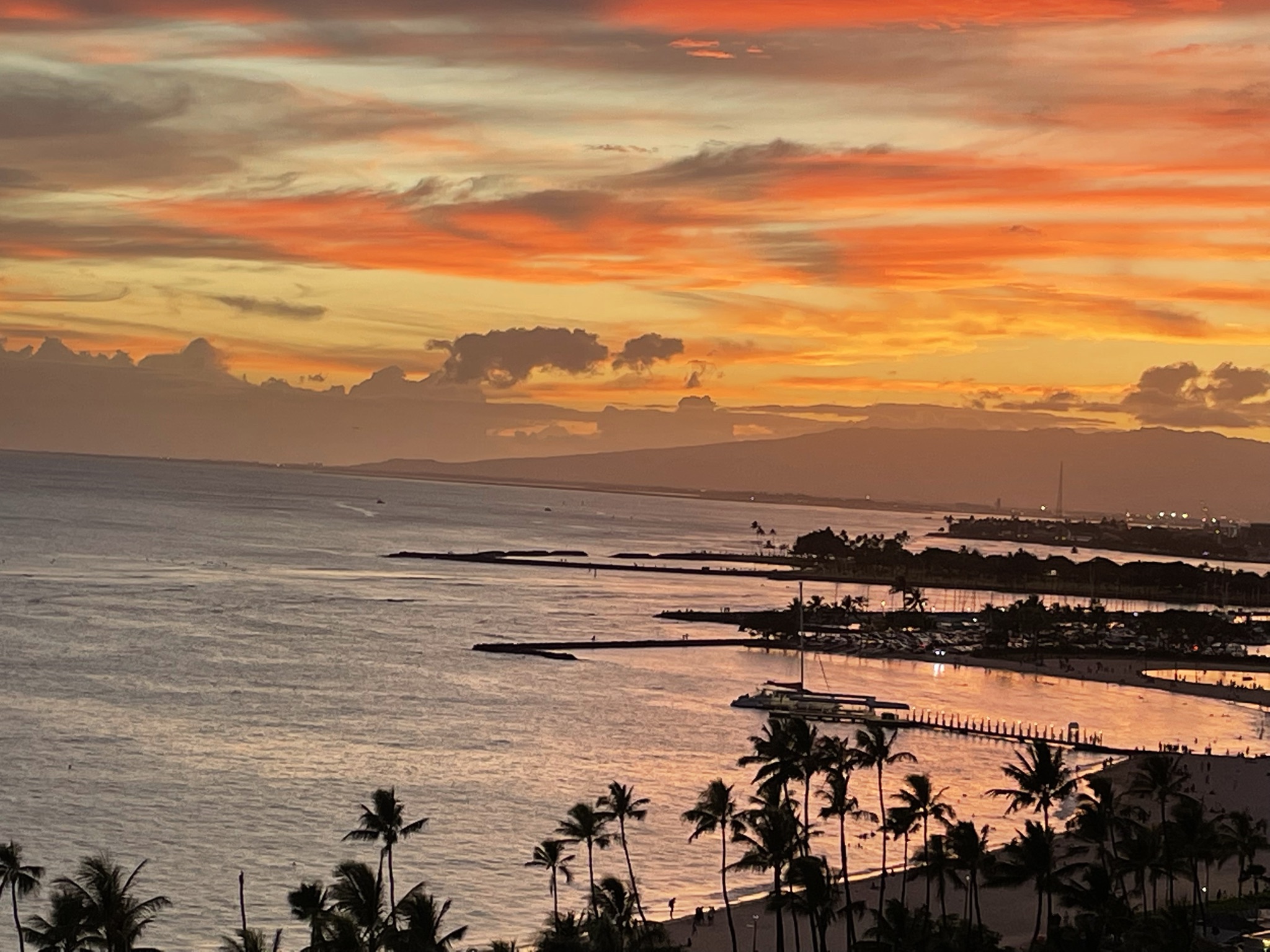 Yesterday was beach time in the morning and a walk to Hilton Hawaiian Village. Then we stopped in Chinatown to pick up leis to greet the kids at the airport. We made a pass through Maunakea Market and bought a bag of lychees. So good! After meeting everyone at the airport, we got hem checked into their rooms and then more beach time. We had dinner plates on the beach and followed up with gelato at a beach side cafe run by Vietnamese. Here is the sunset photo: