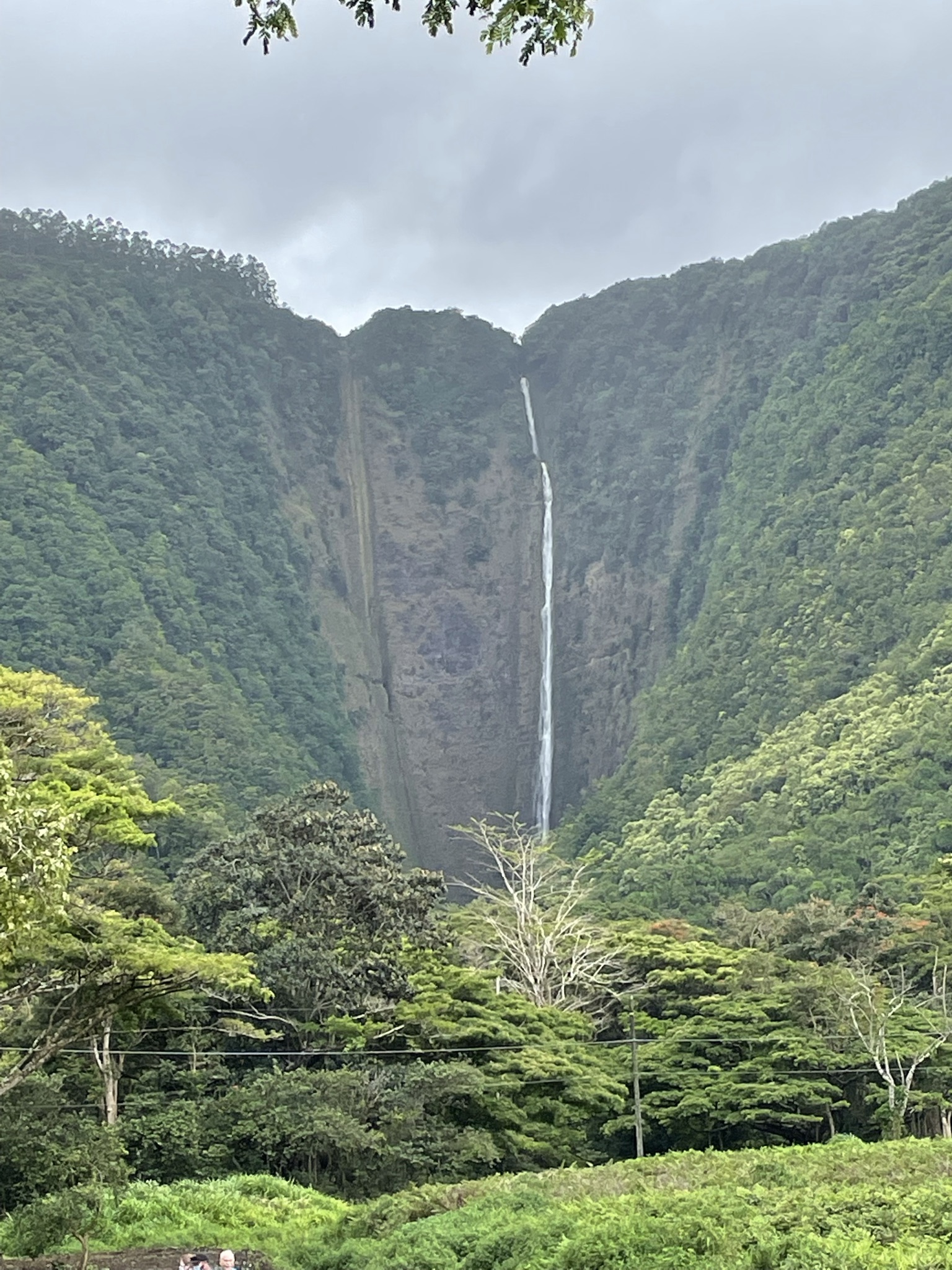 We visited Waipi’o Valley, Thursday. Waipi’o is on the Hamakua Coast near Honokaa. The valley is reachable by a steep, narrow, twisting road which only 4WD vehicles can negotiate. We went with a shuttle tour. Guidebooks recount horror stories of people who have foolishly attempted the road on their own.We visited it earlier when the kids were still here, but went only as far as the lookout. Checkout the post from 6/26. Waipi’o Valley extends about seven miles back from the coast. It was formerly populated by Hawaiian royalty and chiefs. Sometime early in the monarhy, Hawaiian commoners moved in and built fish ponds and taro farms. It sustained a sizable population until the tsunami of April 1, 1946 wiped out most of the farms and dwellings. No lives were lost, but few people returned to the valley Now about 40 people live there, mostly farming taro and raising fruits and vegetables. A herd of wild horses make their home in the valley. They are descendants of survivors of the tsunami. At the back of the valley is one of the largest, most powerful waterfalls in Hawai’i, Hi’ilawe. which drops about 1,450 feet into the valley into Lalakea Stream, and eventually into the ocean. Much of the water of Lalakea is diverted for irrigation.