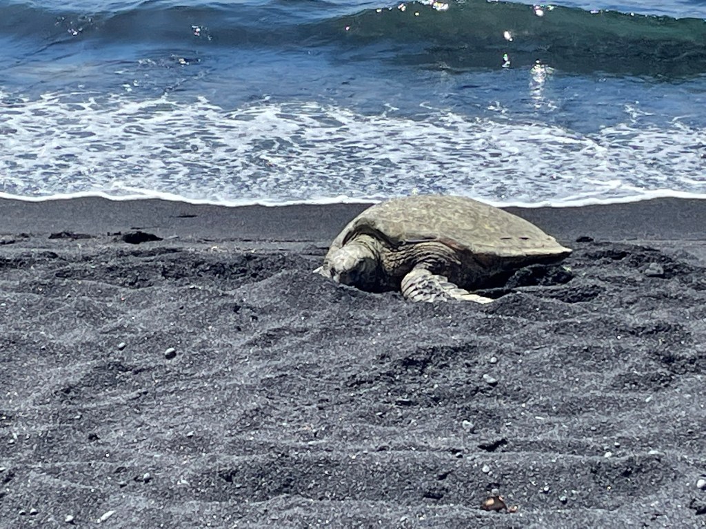 On this excursion, we made a stop at Punaluu Black Sand Beach, which is home to green sea turtles who frequently bask on the beach. Sea turtles almost never bask on a beach, except fo a few species of green sea turtles and only in a few locations. Hawai’i is one of those places. Hawksbill turtles can be found in the waters, but never on the beach. Sea turtles are protected and people are required tto keep their distance.