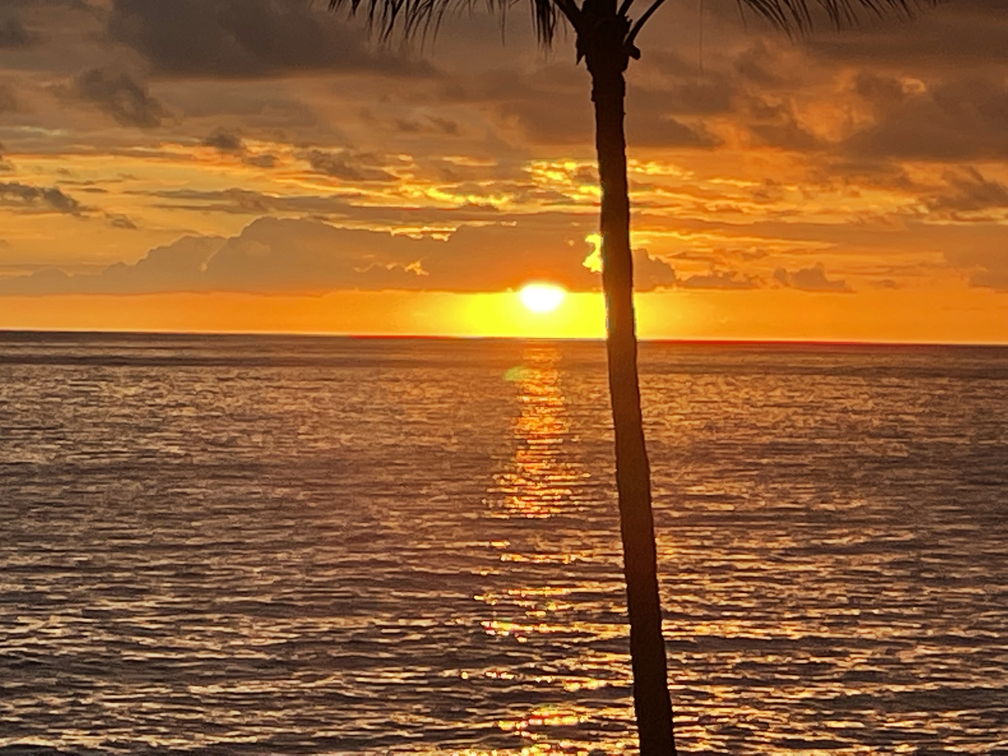 Wednesday, we visited Hapuna Beach and then went to a luau at Mai Grille near the Hilton Waikoloa. Most luau’s are held at a beach. This, however, was held at a golf course. At first we were skeptical. It was smaller in venue than other luau’s, a tad more formal (shoes and masks are required.) The dinner was plated instead of buffet style, which also makes for a different atmosphere. The entertainment was great. The musicians were terrific. I talked to them afterwards about ukes and Hawaiian music. The dancers were a delight to see. Thy avoided the schlocky stuff you often see at luau’s where people from the audience are invited on stage to try to hula while everybody makes fun of them. Even the fire dancer was exciting.