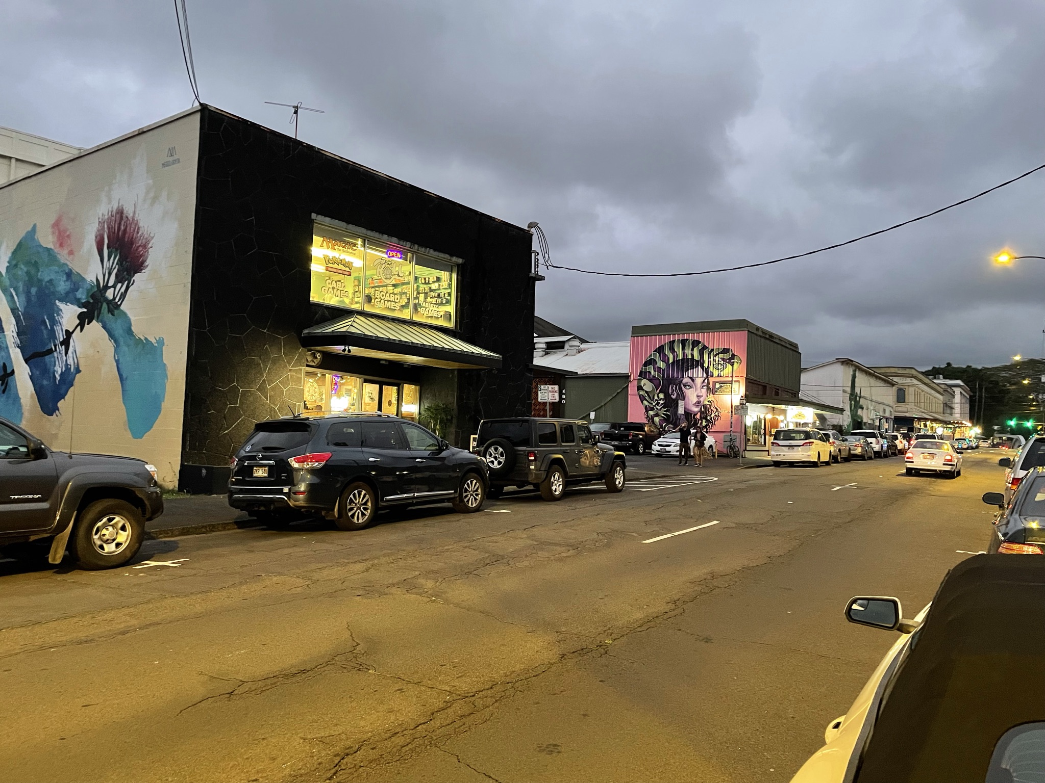 We wen looking for a place to eat and perhaps hear live music. We found Hilo Town Tavern, in the building with the mural of a woman. It’s a dive bar that we were told might have performers. Unfortunately on that night it didn’t. The burgers were big and delicious and the beer was cold, so what more could you ask. The bar is on Keawe St. which has a string of bars and eateries, so we will be returning to it.