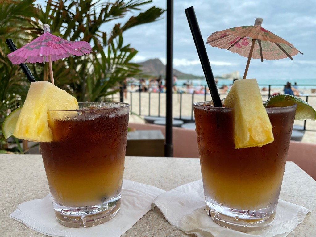 Following the performance at Waikiki Beachwalk, we went for mai tais at the Royal Hawaiian Mai Tai Bar.They pride themselves on having the best mai tais. Their’s is a modification of Vic Bergeron’s original recipe. The only difference is that they add pineapple juice to the mix of orgeat, orange curacao, lime juice, and two rums. Where Vic used light and dark Caribbean rums, the Mai Tai Bar uses Lahaina rums.