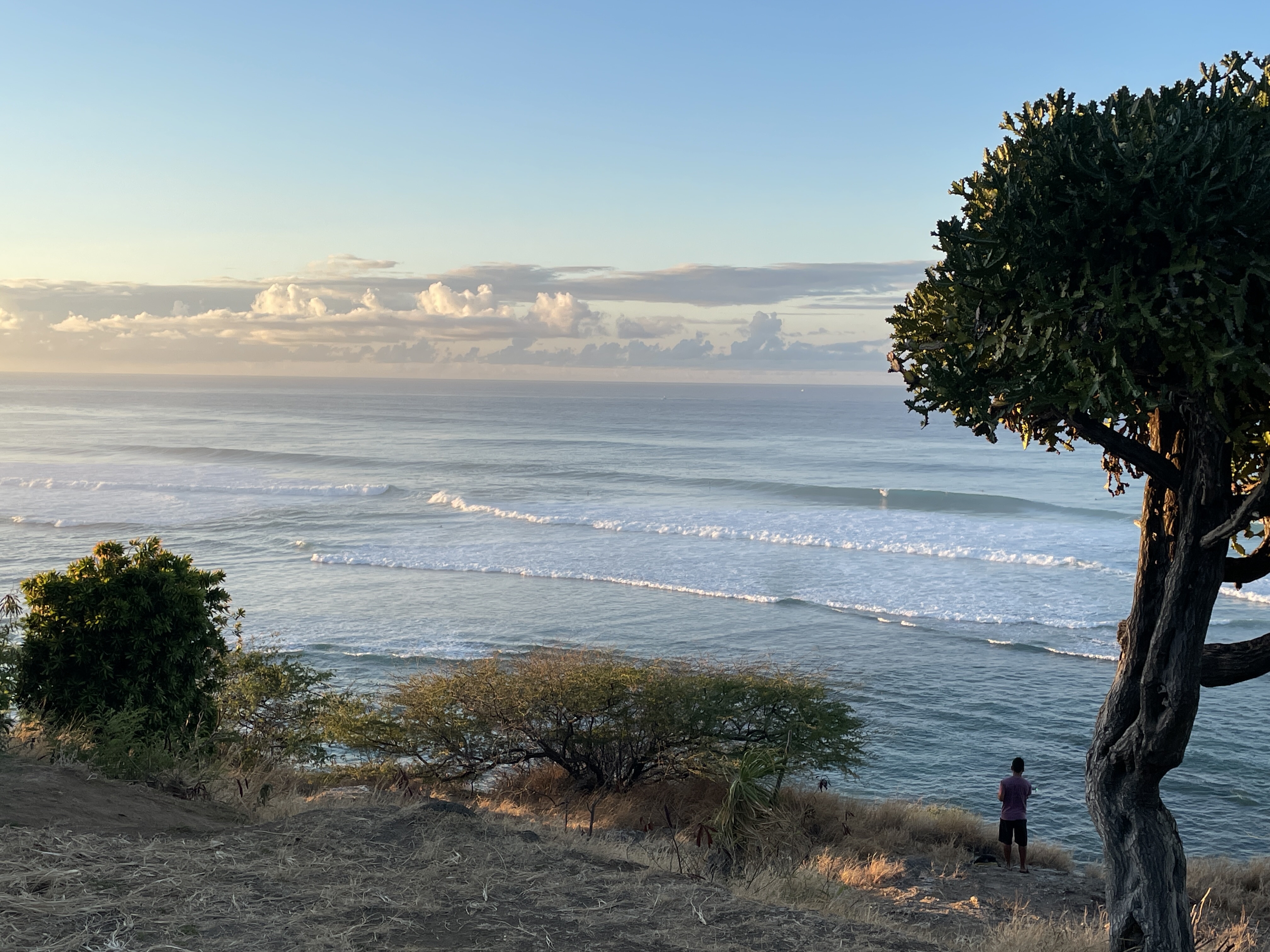 High surf advisories were out this morning. When I went up Diamond Head, I found a lot of surfers checking out the waves. Some were saying the conditions were dangerous and might require some rescues. Not being a surfer, I can’t say, but these are the waves this morning. they do appear larger than on previous days. The guy in the photo is about 300 feet above the ocean.