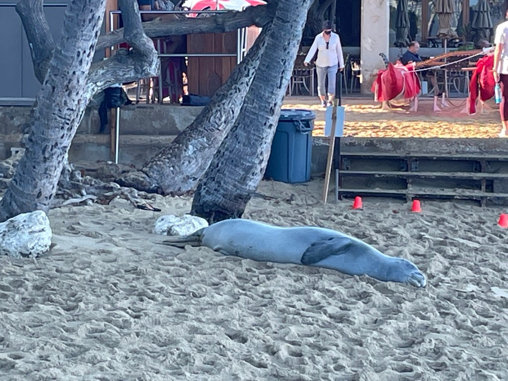 Kaiwi, the female monk seal, who, for the previous two weeks, spent her days at Kaimana Beach near our condo, has now taken up residence on the beach right below our condo. This is the beach used by Outrigger Canoe Club to put their canoes in the water and take them out. The paddlers carry the long, six person canoes, up and down those steps behind Kaiwi. Some of the canoes in their red covers can be seen atop the steps. Outrigger is one of the premier, best funded, canoe clubs in Hawai’i, maybe the world, but they are stymied by Kaiwi. By law, monk seals cannot be disturbed because they are endangered. Whenever one shows up at a beach, as Kaiwi does, animal welfare folks mark off an area around her, in which people are not allowed to enter. The orange cones define the protected area. Right up to the Outrigger steps. There is no way they can get canoes up or down while Kaiwi is sunning herself.