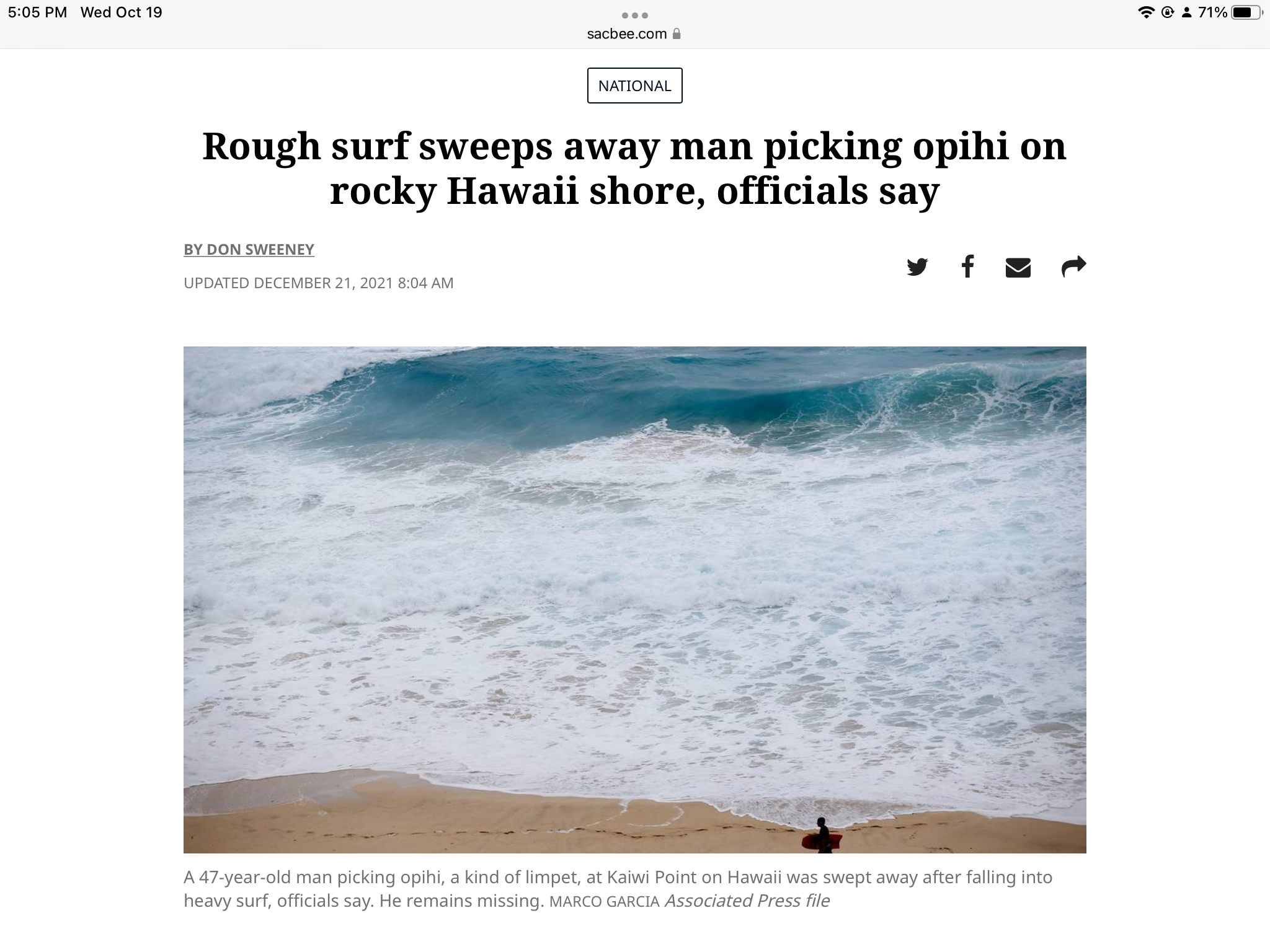 Harvesting opihi is done by opihi pickers or opihi men. It’s a dangerous job as it requires getting out on rocks in the surf with a knife to pry the little suckers loose. Pickers occasionally lose their lives picking. Thus the warning in the song: “Keep your eye on the wave, don’t ever turn your back.” A good lesson for all of us.